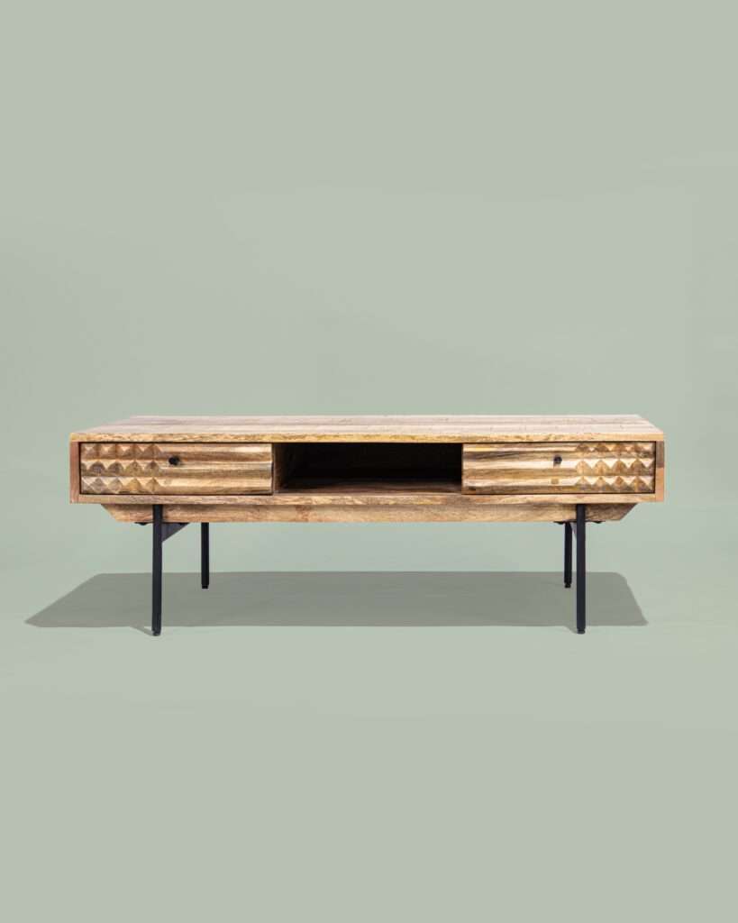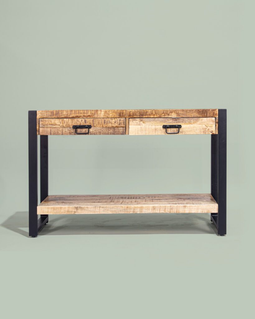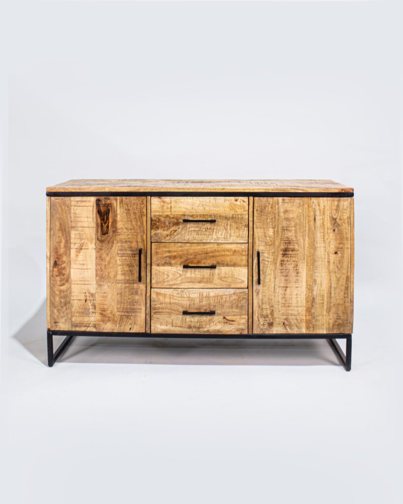 קומודת עץ מנגו מלא בשילוב מתכת, בעלת שתי דלתות ושלוש מגירות אחסון. קומודה יציבה ואיכותית בעלת יכולת נשיאת משקלים כבדים.